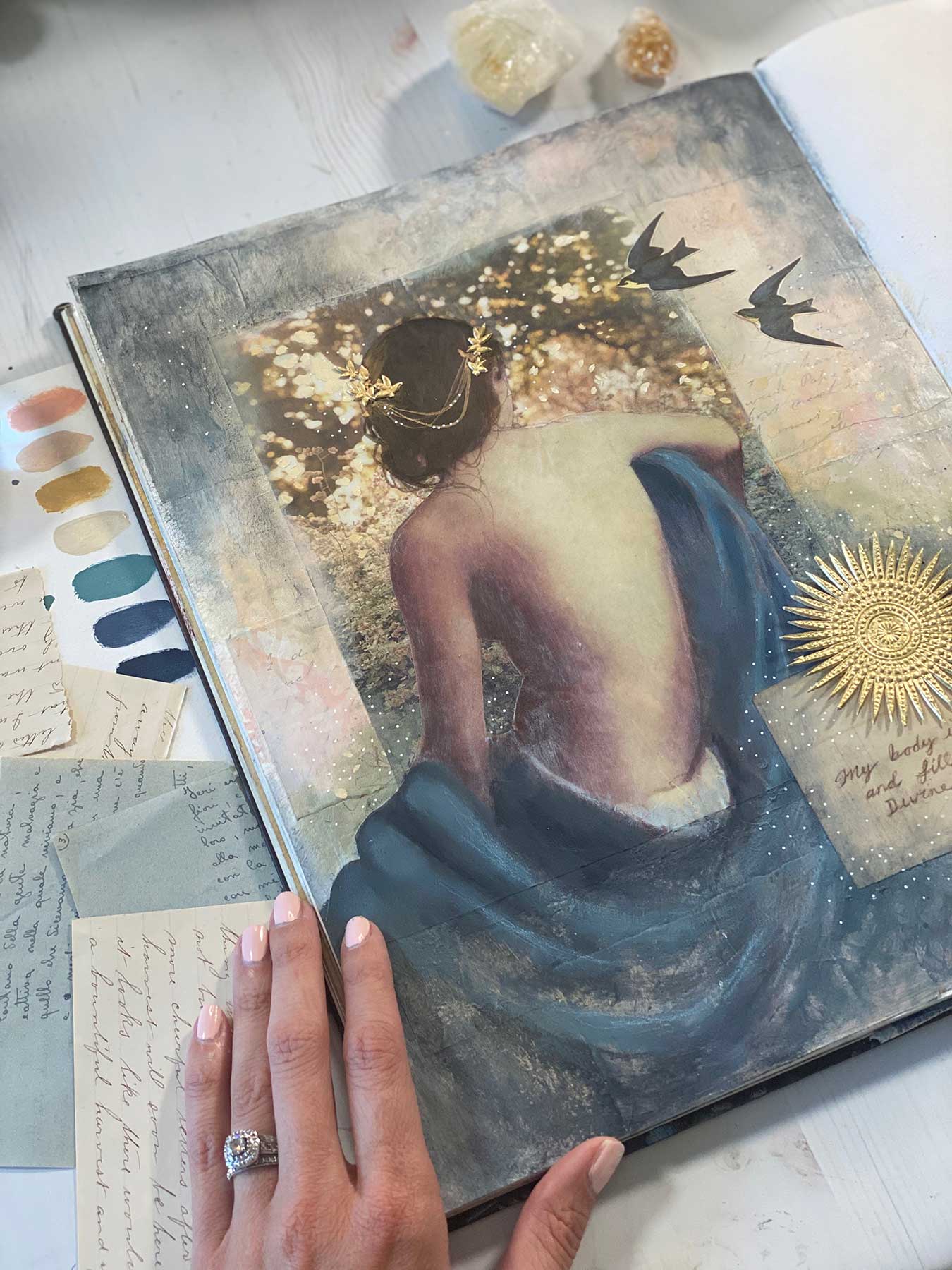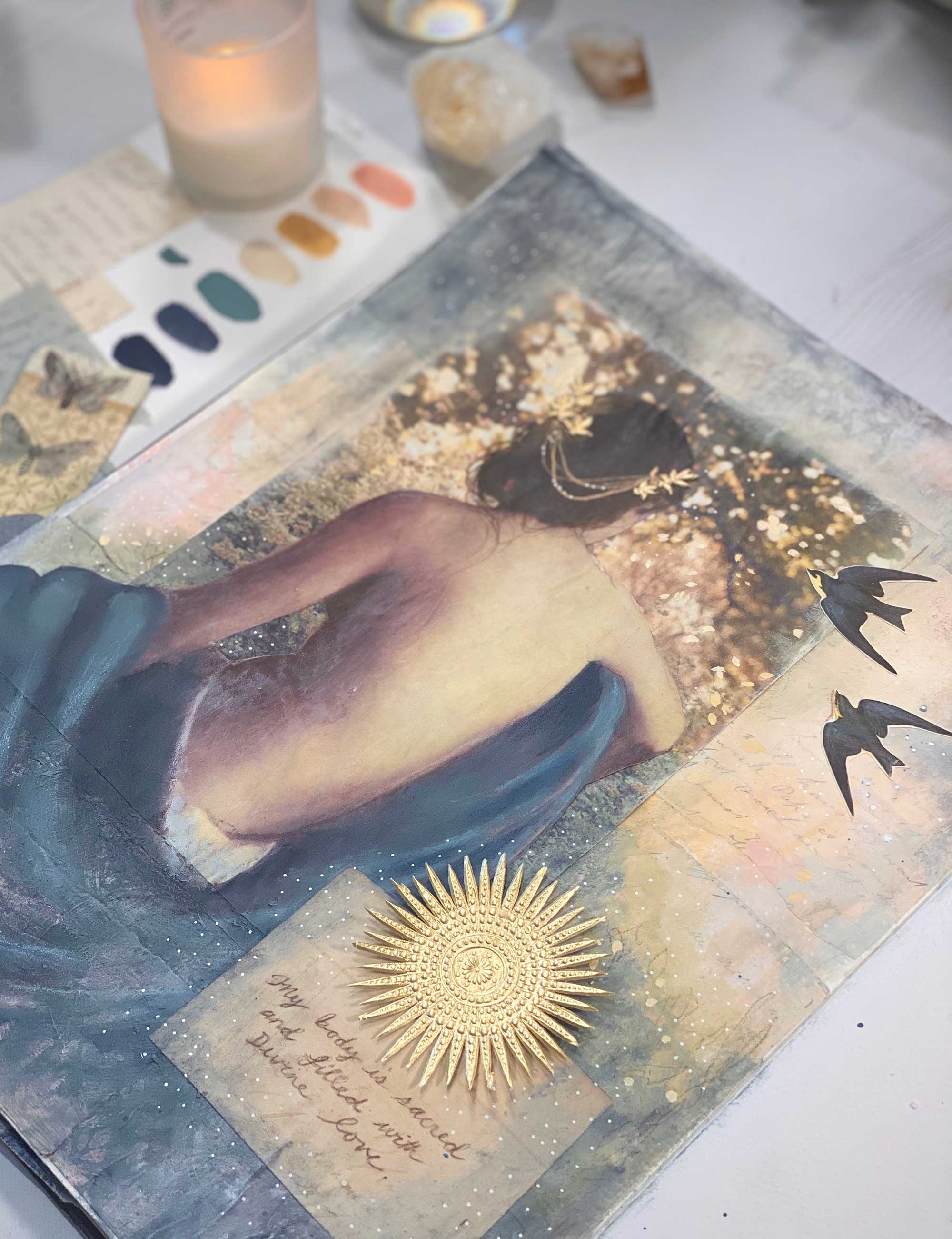 This mixed media collage will focus on embracing the beauty, strength, and divine wonder of our bodies. With self-love and compassion, we begin with a letter to our bodies as the foundation of our journal page.
